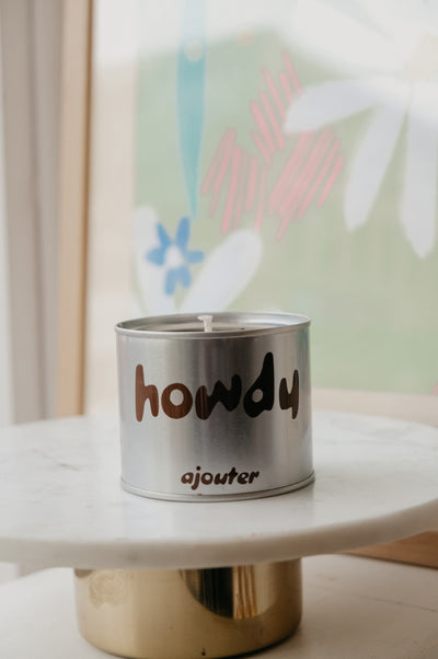 Rodeo ready with the rich smoky wood Howdy Candle. This tin candle has a rich smoky woody accord with top notes of citrus, birch and cedarwood leading to a heart of black leather on a rich base of amber and woods.