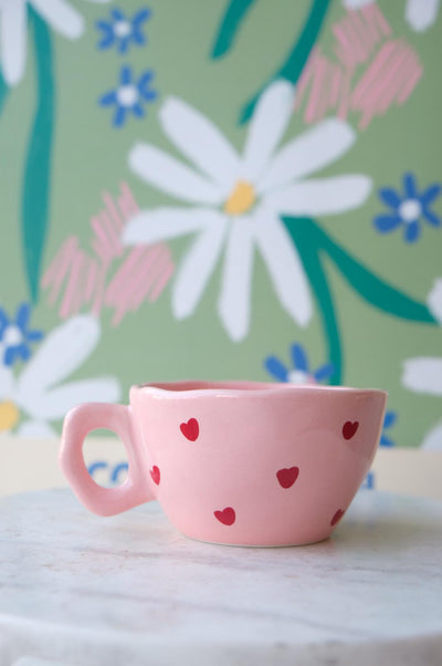 Romanticise your morning with this baby pink mug complete with mini red love hearts. Featuring an irregular handle shape (our team have tested this and confirm it's comfy and easy to hold!), this handmade ceramic mug will be the perfect morning companion.
