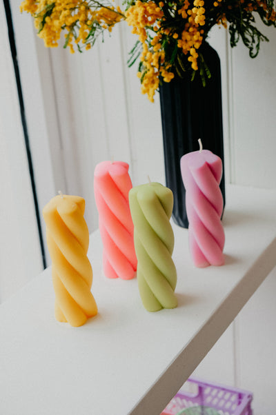 A twist on traditional candle styles. Light up your coffee table, mantelpiece or dining table with our handmade Twist Spiral Handmade Vegan Soy Wax Candles. Each candle is handmade at Ajouter HQ from 100% natural soy wax and natural dyes. As each might be a slight difference in colour - that's what makes them unique!