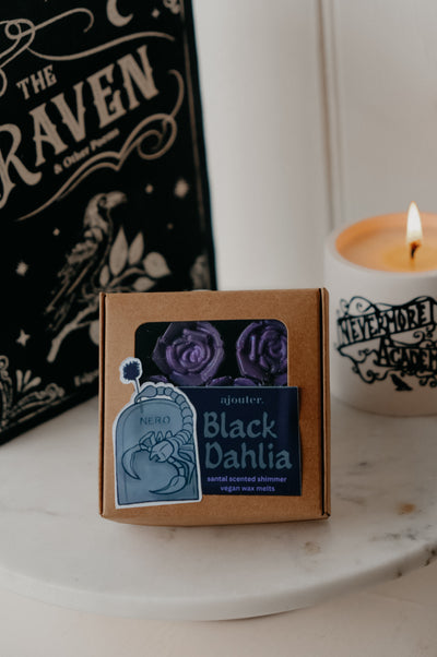 RIP Nero, an ode to the little Scorpion. Spooky aesthetic all over with the black dahlia and santal scented wax melts that will shimmer once fully melted.