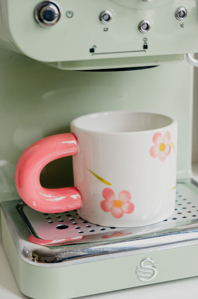 Wake up to the Polli Flower White and Pink XL Mug . The ceramic mug features pink flowers and an XL handle. Sending this set as a gift? Add a gift message at checkout.