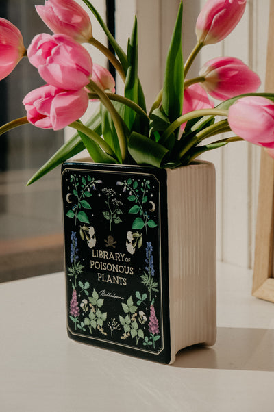 Dark romance bookish aesthetic with the Poisonous Plants Book Dark Romance Vase. Perfect for holding fresh or dried flowers, displaying foliage, or standing alone as a decorative piece.