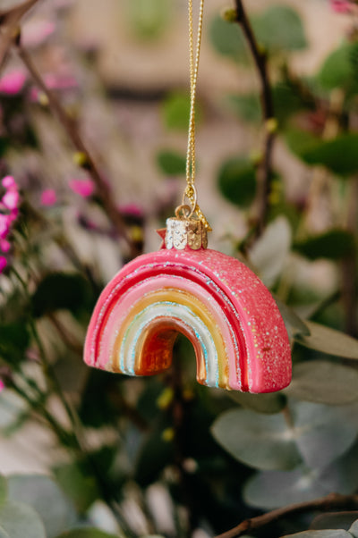 Brighten up your spring tablescape! This glass rainbow with glitter will be a staple in your easter decor for years to come. Hang from a tree to create the perfect tablescape.