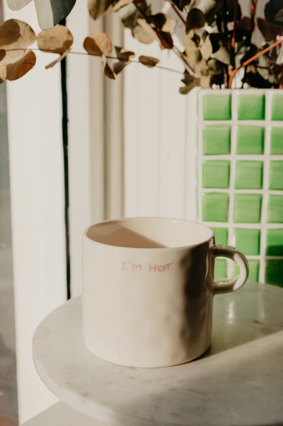 Extra hot and with an extra shot. In a neutral glaze the mug features a handpainted slogan 'im hot’. Finished in a lightly hammered style and a round handle (yes, we can confirm it's super easy to hold!). Sold individually.