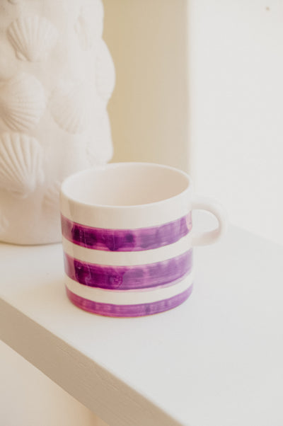 XL for your morning coffee. The Rowe Coffee Mug features handpainted pink thick stripes on a white glazed mug. Finished in a lightly hammered style and a round handle (yes, we can confirm it's super easy to hold!). Sold individually.