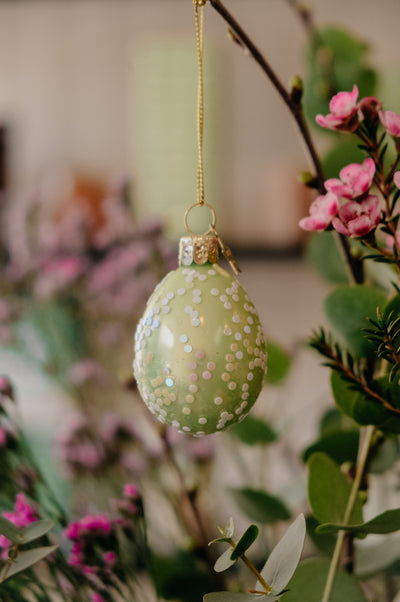 This glass sage green with iridiscent detailing will be a staple in your easter decor for years to come. Hang from a tree to create the perfect tablescape.