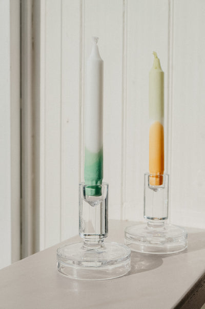 Equally minimalist and maximalist, the chunky glass candle holder will be an elegant touch to your space. The solid glass allows light to pass through creating a striking effect. No matter your interiors the clear candle holder can be paired with any our pillar candles that come in array of shapes and colour-ways. Also available in amber tan.