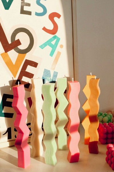 Shake your homeware aesthetic with the Squiggly and Bolt Pillar Soy Candles. Whether it's dressing up your dining table, shelfie or as a gift, these candles are a unique take on the classic pillar style. Each candle is handmade at Ajouter HQ from 100% natural soy wax and natural dyes. As each might be a slight difference in colour - that's what makes them unique!