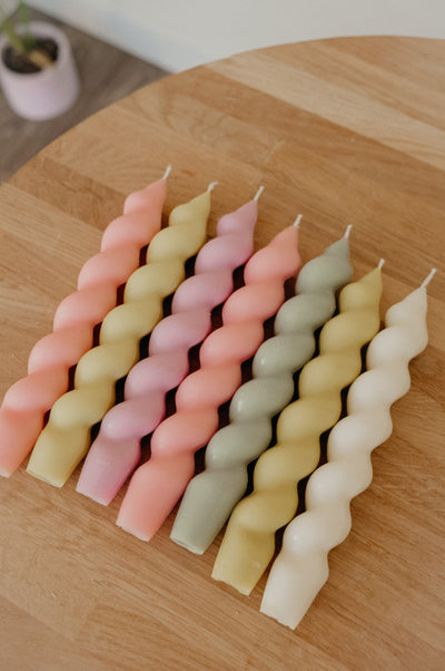 A twist on traditional pillar candle styles. Light up your coffee table, mantelpiece or dining table with our handmade Twist Spiral Handmade Vegan Soy Wax Candles. Want to really impress your guests? Pair these pillar candles with our glass candle holders, for the perfect tablescape look. Each candle is handmade at Ajouter HQ from 100% natural soy wax and natural dyes. As each might be a slight difference in colour - that's what makes them unique! Sold as a pack of 2 - you will receive 2 candles of the same colour. Candle holders are sold separately.