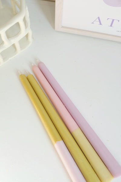 Light up your coffee table, mantelpiece or dining table with our handmade Two-Tone Dipped Tapered Pillar Vegan Soy Wax Candles. Whether its the two-tone dipped style or block colour, these pillar candles looks extra cute paired with our Handmade Daisy Flower Pillar Candle Holders. Each candle is handmade at Ajouter HQ from 100% natural soy wax and natural dyes. As each might be a slight difference in colour - that's what makes them unique! Sold as a pack of 2 - you will receive 2 candles of the same colour. Candle holders are sold separately.
