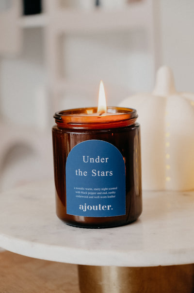 Cosy season is complete with the Under the Stars Autumn Soy Wax Candle. Strike a match to a nostalgic warm, starry night scented with black pepper and oud, earthy ceadarwood and well-worn leather