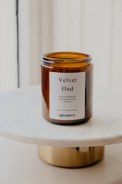 Strike a match and set a cosy mood with the Velvet Oud Soy Wax Handmade Candle. Expect smoky tonka bean and oud wood that is set on a velvet amber base. Comes complete with an Ajouter dustbag.