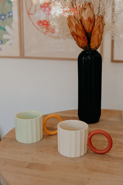 The Willow Layered Round Handled Mug is here for when you need an XL hot beverage. Featuring a statement round handle shape (our team have tested this and confirm it's comfy and easy to hold!), this handmade ceramic mug will be the perfect WFH companion. Available in mint green with an orange handle and cream with an amber handle.