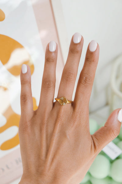 The Sinead Round Sunburst Signet 18k Gold Plated Ring will slip straight into your currently jewellery box. This vintage-inspired style could easily pass as a family heirloom and makes for a lovely addition to your ring stack. Comes complete with an Ajouter white cotton branded bag with green ribbon.