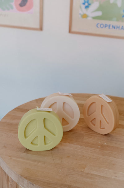 Keep your space mellow with our handmade peace sign candle. With a retro 60s inspired vibe, this candle will make for the perfect shelf or coffee table addition. Each candle is handmade at Ajouter HQ from 100% natural soy wax and natural dyes. As each might be a slight difference in colour - that's what makes them unique! All candles come complete with an Ajouter branded ribbon tie bag.